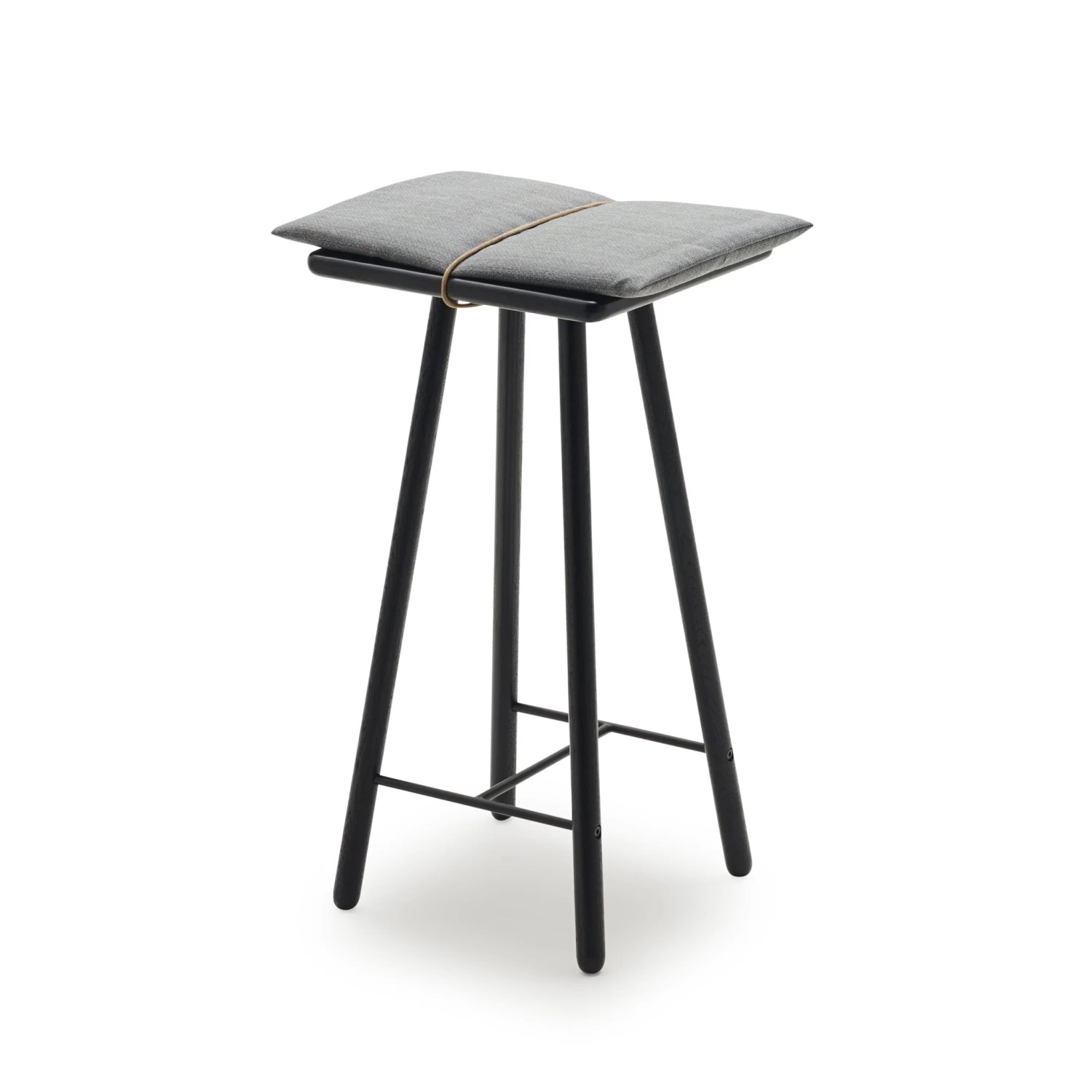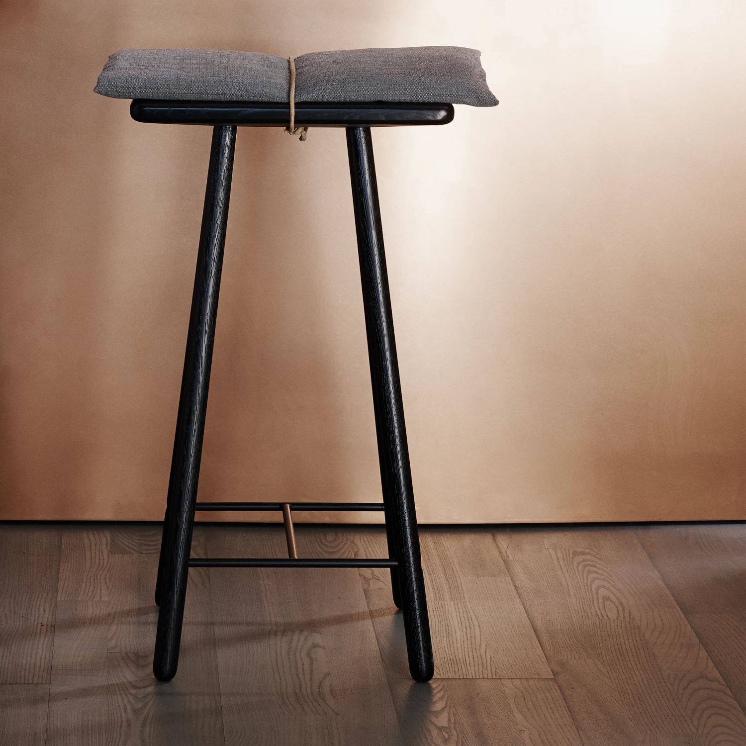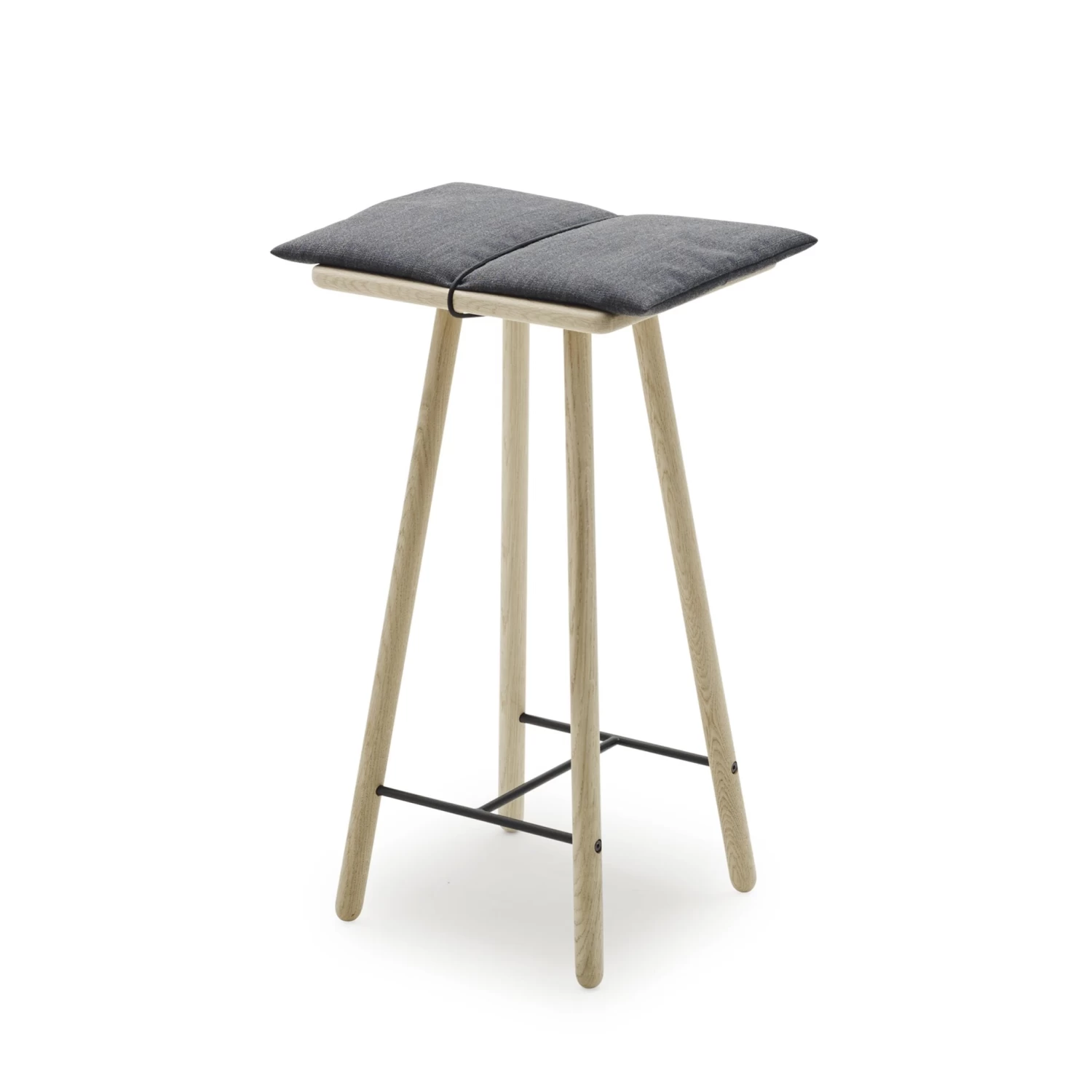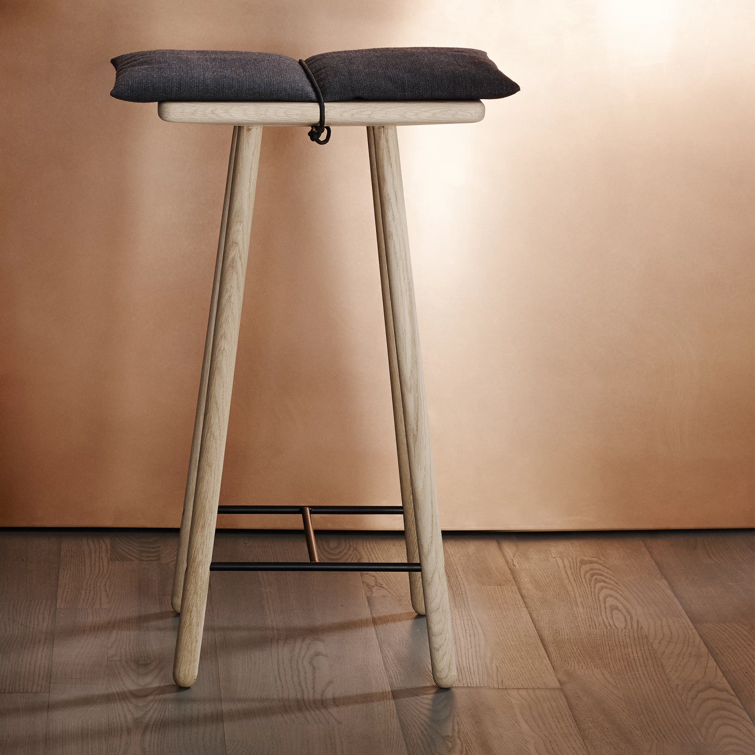 Have a seat at Georg Barstool, a stylish result of the meeting between Nordic sensuality and Japanese minimalism. The design is characterised by the slender wooden poles and soft surface, where a woollen cushion is kept in place by a braided leather strap. The legs are stabilised by metal H-frame that also serves as a footrest.