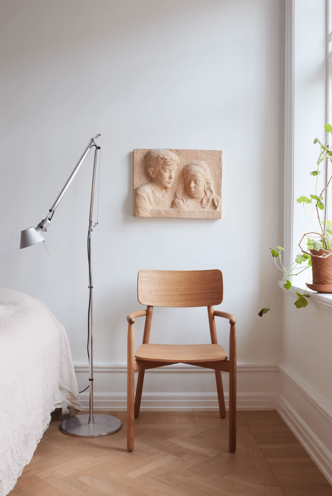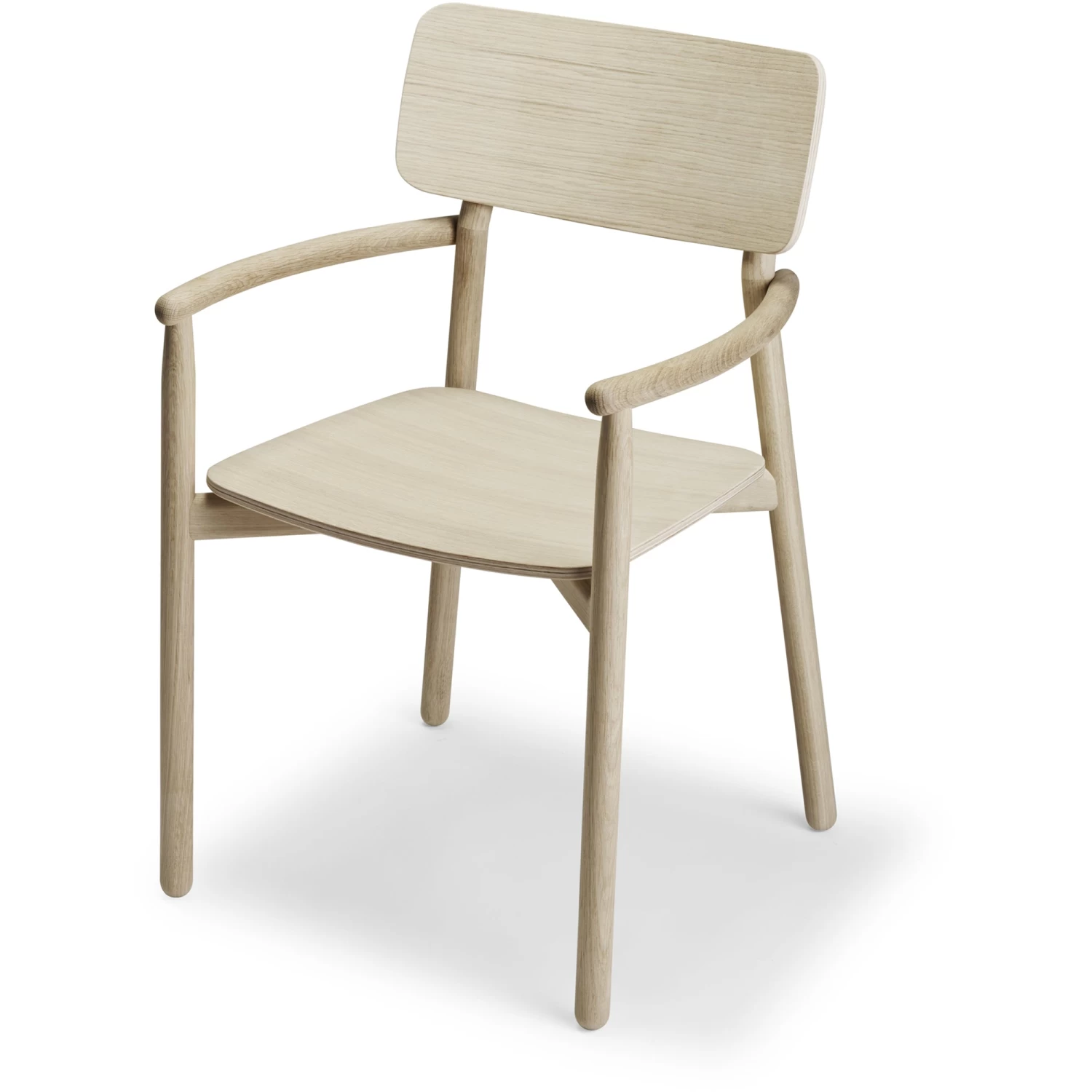 An embracing and comfortable armchair designed to support happy moments around the dining table. Hven Armchair carries a light expression highlighted by few subtle details such as the overlapping poles, round corners and curved shape. The Hven Armchair in natural oak is untreated, but is available with white soap, oil, or white oil treatment. Please inquire.