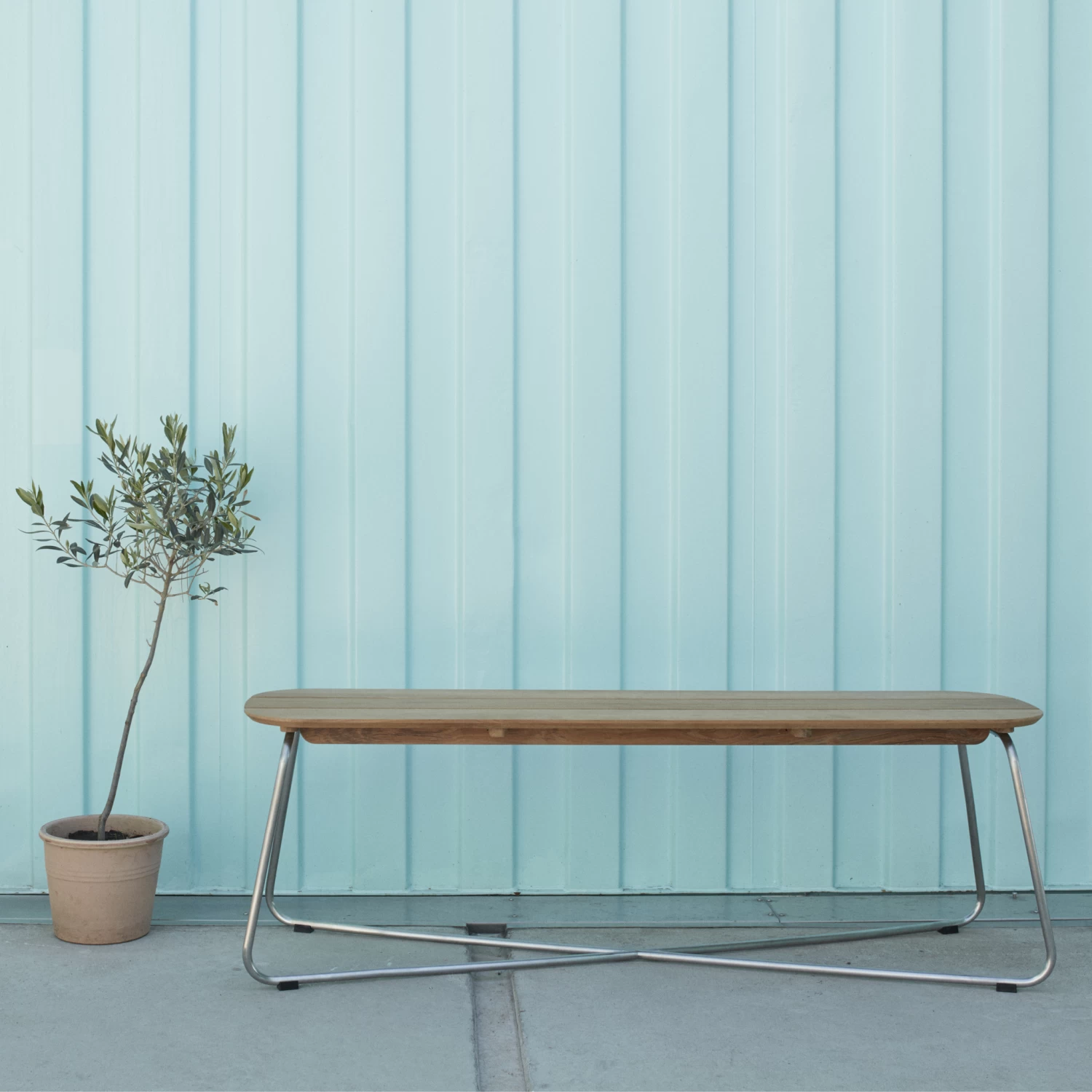 Lilium bench is not just a versatile bench but also doubles as a lounge table or outdoor plant stand. Based on the same design premises as the rest of the series, Lilium bench is both light and sturdy with its X-shaped frame in stainless steel and tabletop in teak planks placed lengthwise for a slender expression – just like the dining table.