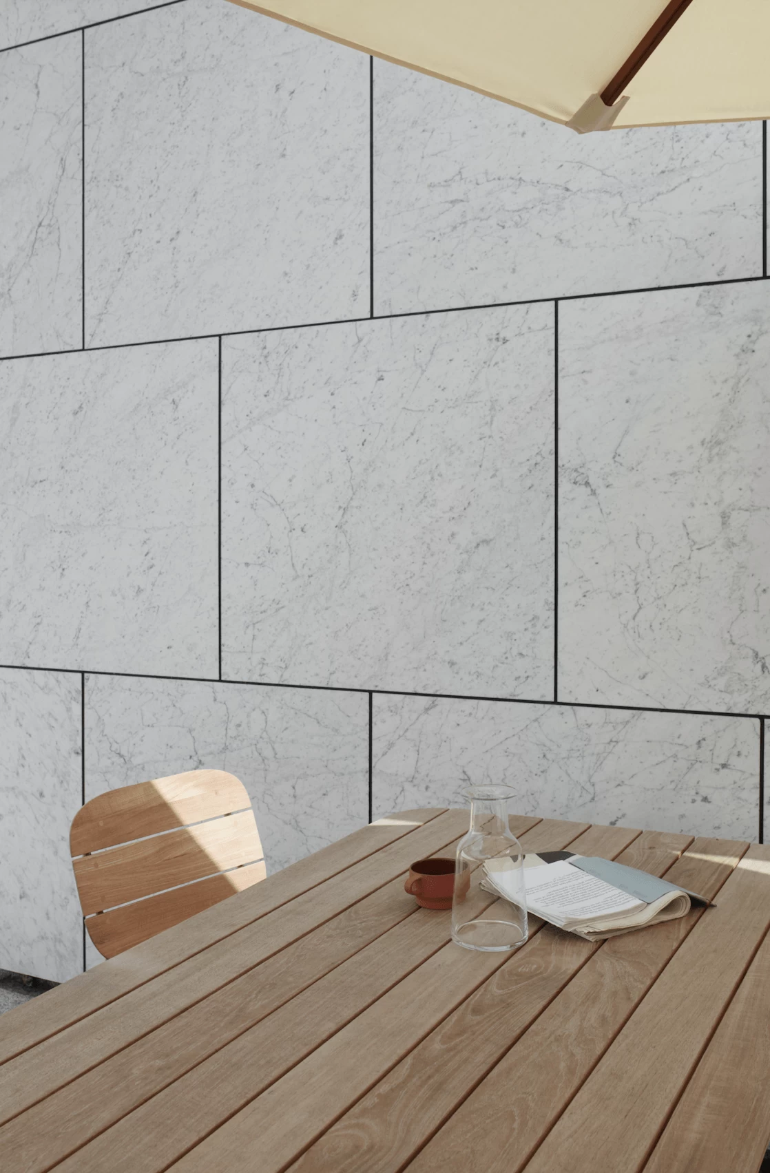 Lilium is easy on the eye and a pleasure to use. The light but strong frame in stainless steel seems to prolong the oblong tabletop all the way to the ground. The tabletop is made of teak planks placed lengthwise to make the table look even longer – with plenty of room for the four to six persons that the table seats.
