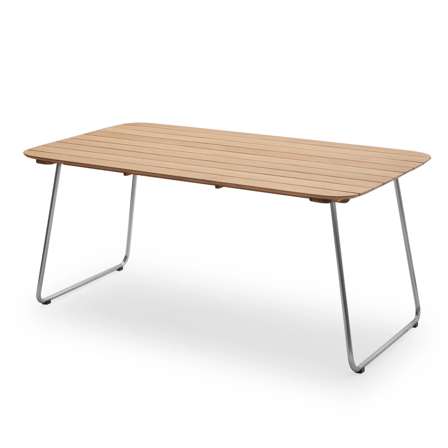 Lilium is easy on the eye and a pleasure to use. The light but strong frame in stainless steel seems to prolong the oblong tabletop all the way to the ground. The tabletop is made of teak planks placed lengthwise to make the table look even longer – with plenty of room for the four to six persons that the table seats.