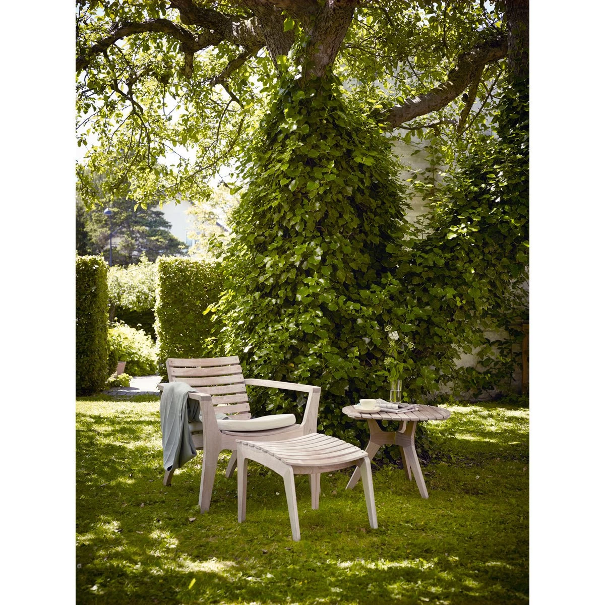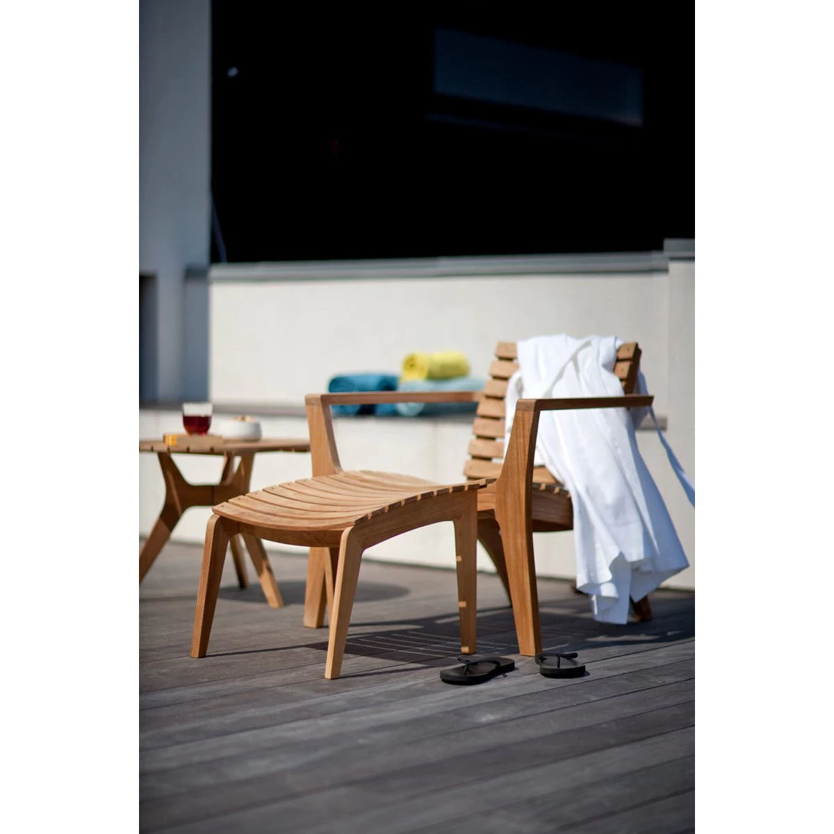 Put up your feet in style. The superb Regatta range makes for a relaxed lounge atmosphere on the patio. The Regatta is made of solid teak slats. Besides its elegant appearance, teak is unsurpassed as a material for outdoor furniture that needs to remain beautiful and practical year after year. Teak is rich in natural oils and core substances that hold the wood fibers together, preventing cracking and enabling the wood to counteract rot. The Regatta Lounge Chair and Footstool are integrated, robust pieces of furniture, with slats that add a light and airy look and feel. The low table is practical when you want somewhere handy to put a book or a cool drink.