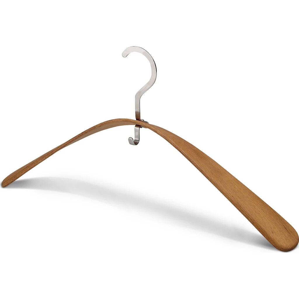 A classy, wing-formed coat hanger in steam bent teak and stainless steel. Skagerak Pilot coat hanger is the ultimate hanger. It is elegant and streamlines formed. Practical is over all, the additional hook at the hanger that can be used to hang of scarves, neck clothes and bags.