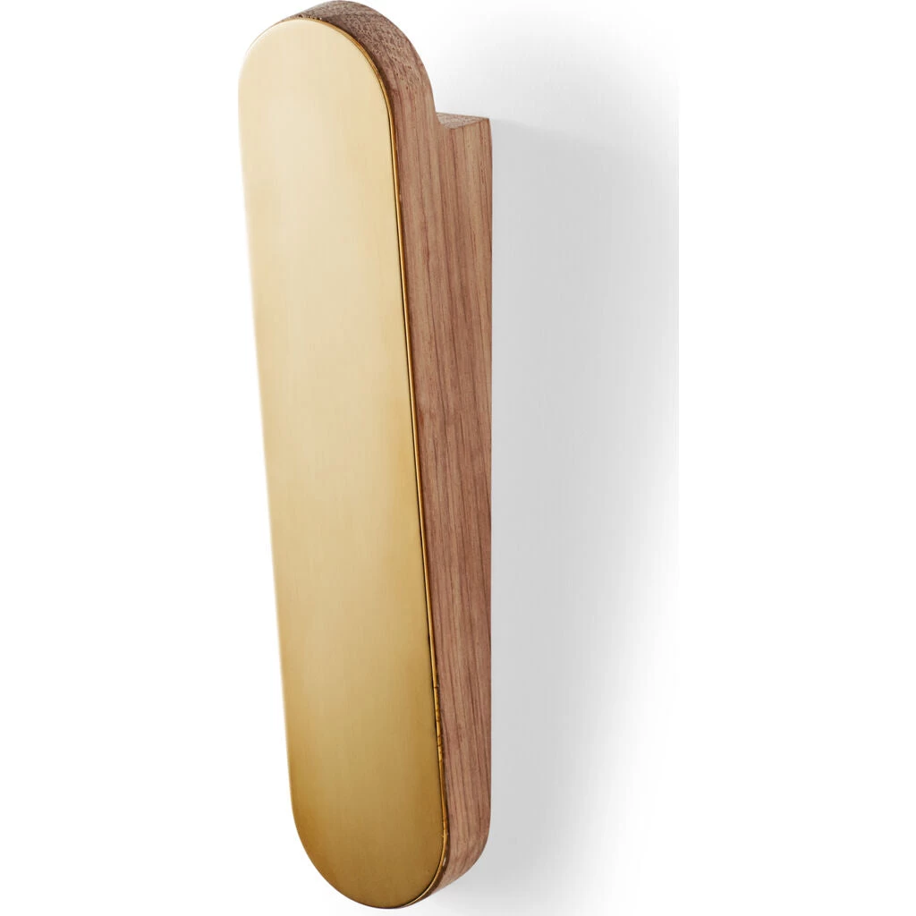 Reflect Hook is mixing light oak and brass in a form and expression inspired by the oval-shaped athletics track. The hook is leaning slightly backwards from the wall, making it easy to hang coats and scarfs on it. Designed by Nina Tolstrup.