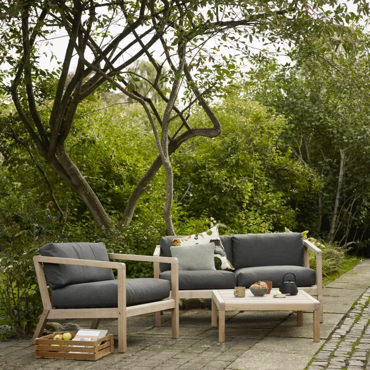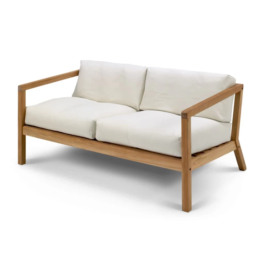 The Skagerak Virkelyst Sofa is a modern outdoor sofa with the seating comfort of an indoor furniture. The simple wooden frame strikes a contrast with the thick, soft cushions. The upholstery of the Virkelyst Outdoor Sofa are Oeko-Tex certified and are not only extremely color and lightfast but also water, dirt-repellent and mildew-resistant. The solid teak frame is simple and high quality that without treatment will turn a beautiful silvery grey color. Should you wish to retain the classic teak “honey” appearance, regular treating is required.