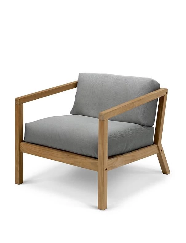 Virkelyst Chair is a modern outdoor chair with the seating comfort of an indoor furniture. The simple wooden frame strikes a contrast with the thick, soft cushions. The upholstery fabrics are Oeko-Tex certified and extremely colour and lightfast as well as water and dirt-repellent and even mildew-resistant. The cushion is filled with airy fossflakes – an allergy-friendly polyethylene material which maintains its volume and shape over time.